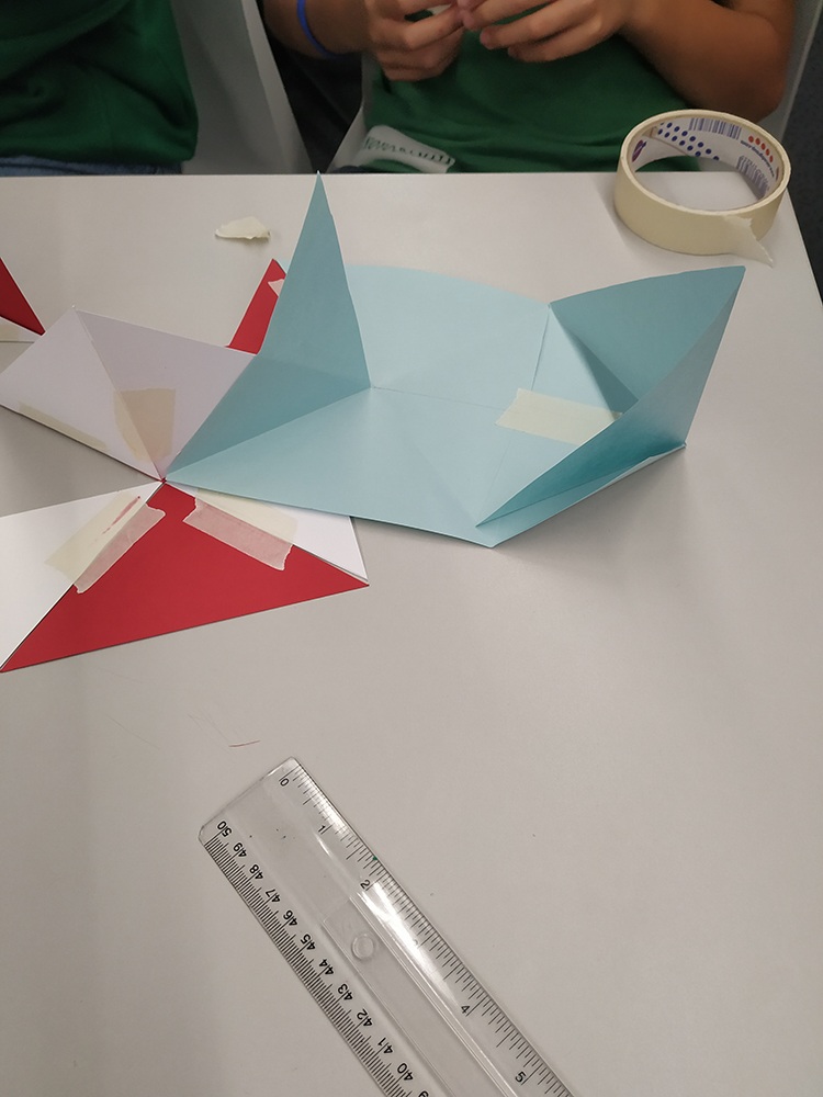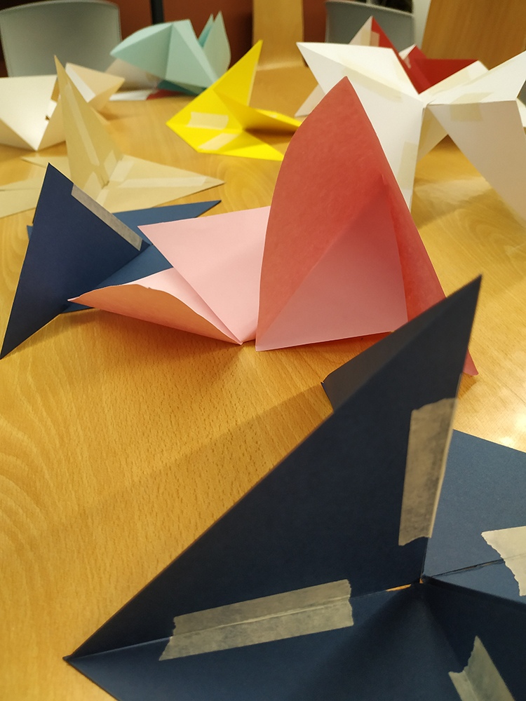 Através da dobragem de papel, com apenas alguns cortes feitos com a tesoura, e colagem com fita cola, os participantes puderam construir alguns dos bichos inspirados na obra da artista brasileira.
